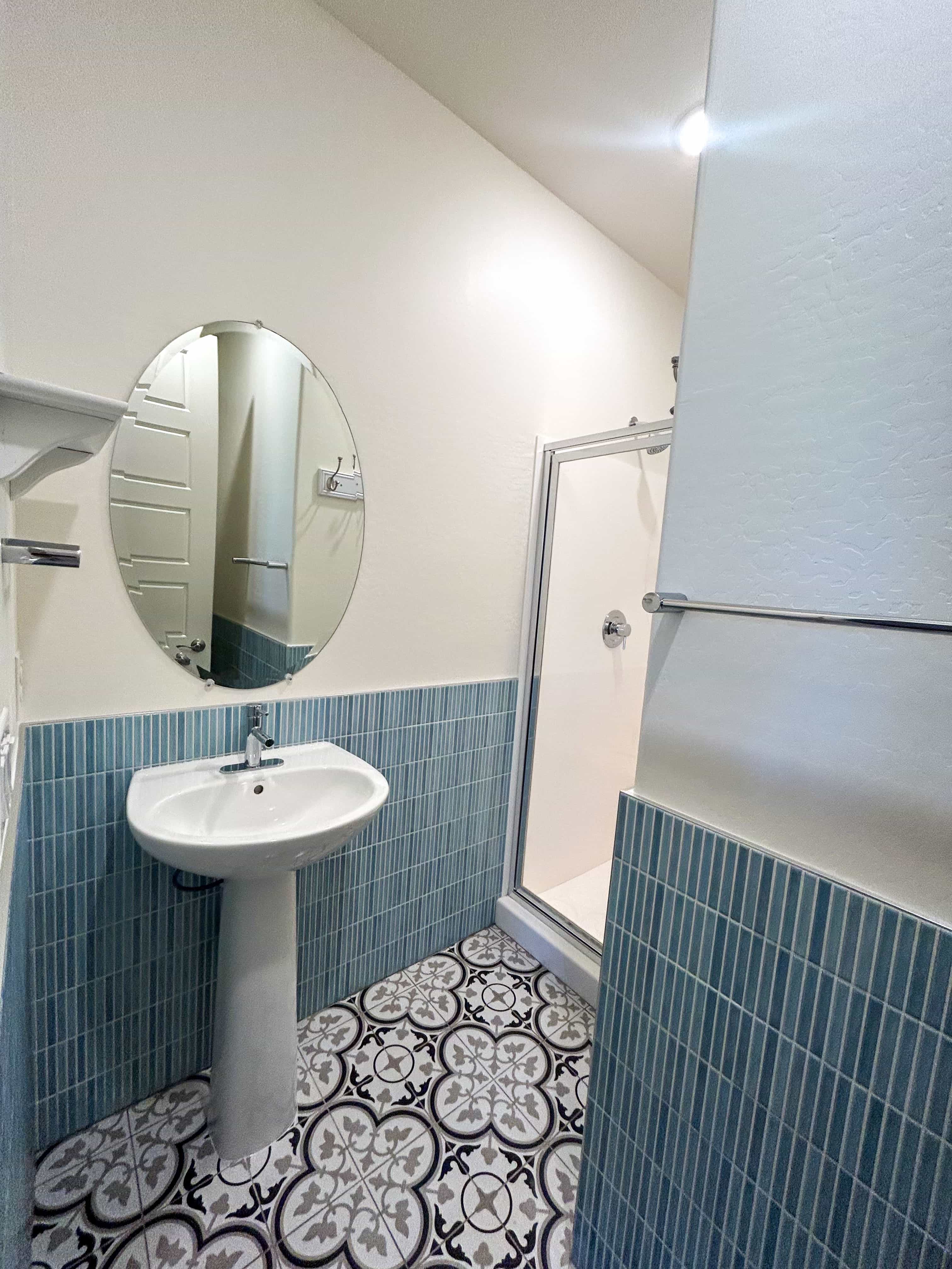 Get Started NowA compact bathroom transformation blending bold character with refined finishes. The result is a fresh, modern space with a touch of timeless charm.