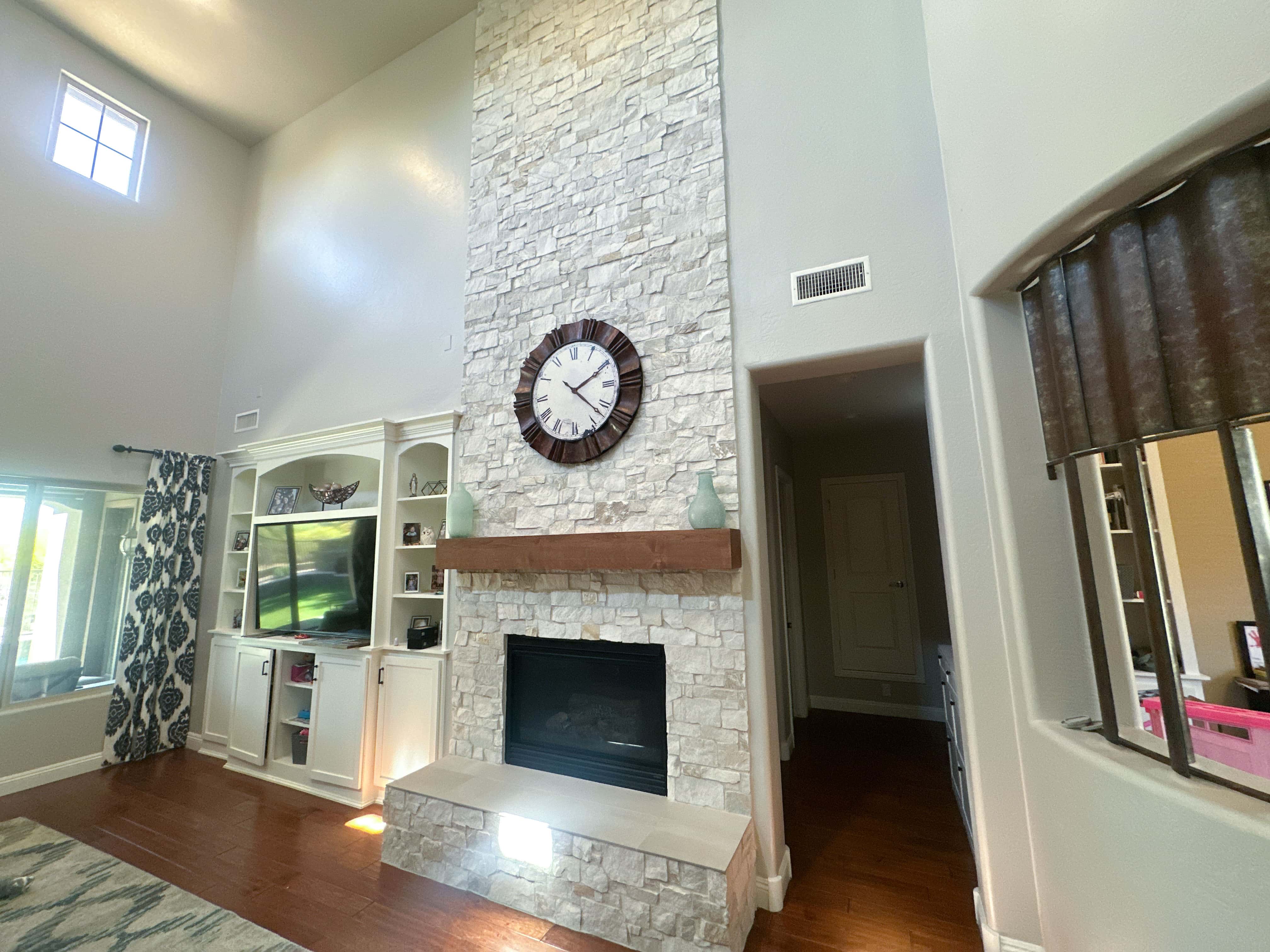 Get Started NowA striking floor-to-ceiling stone fireplace creates a bold focal point in this open living space. The natural texture is balanced by a clean wood mantel and built-in cabinetry for a polished, functional look. Light, neutral tones enhance the room’s height and bring a warm, timeless feel.